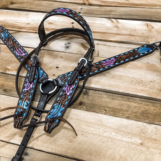 1D Hand Tooled Collection Blue and Pink Feather Headstall and Breastcollar Set